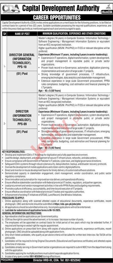 Director General (Information Technology) PPS-10 & Director (Information Technology) PPS-09 — Capital Development Authority (CDA), Islamabad