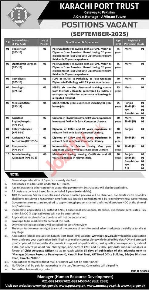 Karachi Port Trust (KPT) Healthcare Jobs — Pediatrician, Ophthalmic Surgeon, Pathologist, Sonologist, Medical Officer, Physiotherapist, X-Ray Staff, Compounder & Female Nursing Attendant (September 2025) | Karachi, Sindh