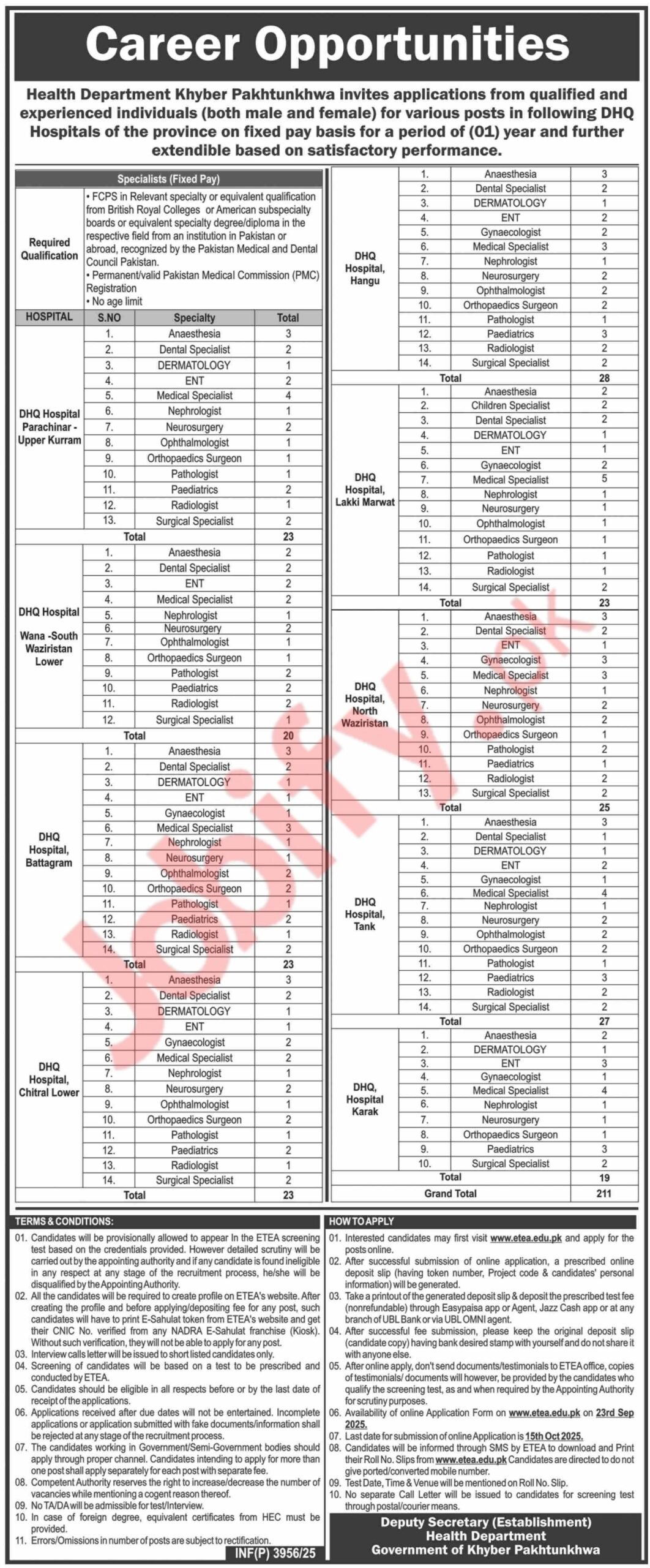 The Health Department, Government of Khyber Pakhtunkhwa (KP) is recruiting Specialists on fixed pay for multiple District Headquarters (DHQ) Hospitals across the province. Open specialties include Anaesthesia, Dental, Dermatology, ENT, Gynaecology, Medicine, Nephrology, Neurosurgery, Ophthalmology, Orthopaedics, Pathology, Paediatrics, Radiology, and Surgery. Appointments are for one (01) year on a fixed-pay basis, extendable on satisfactory performance and service need.