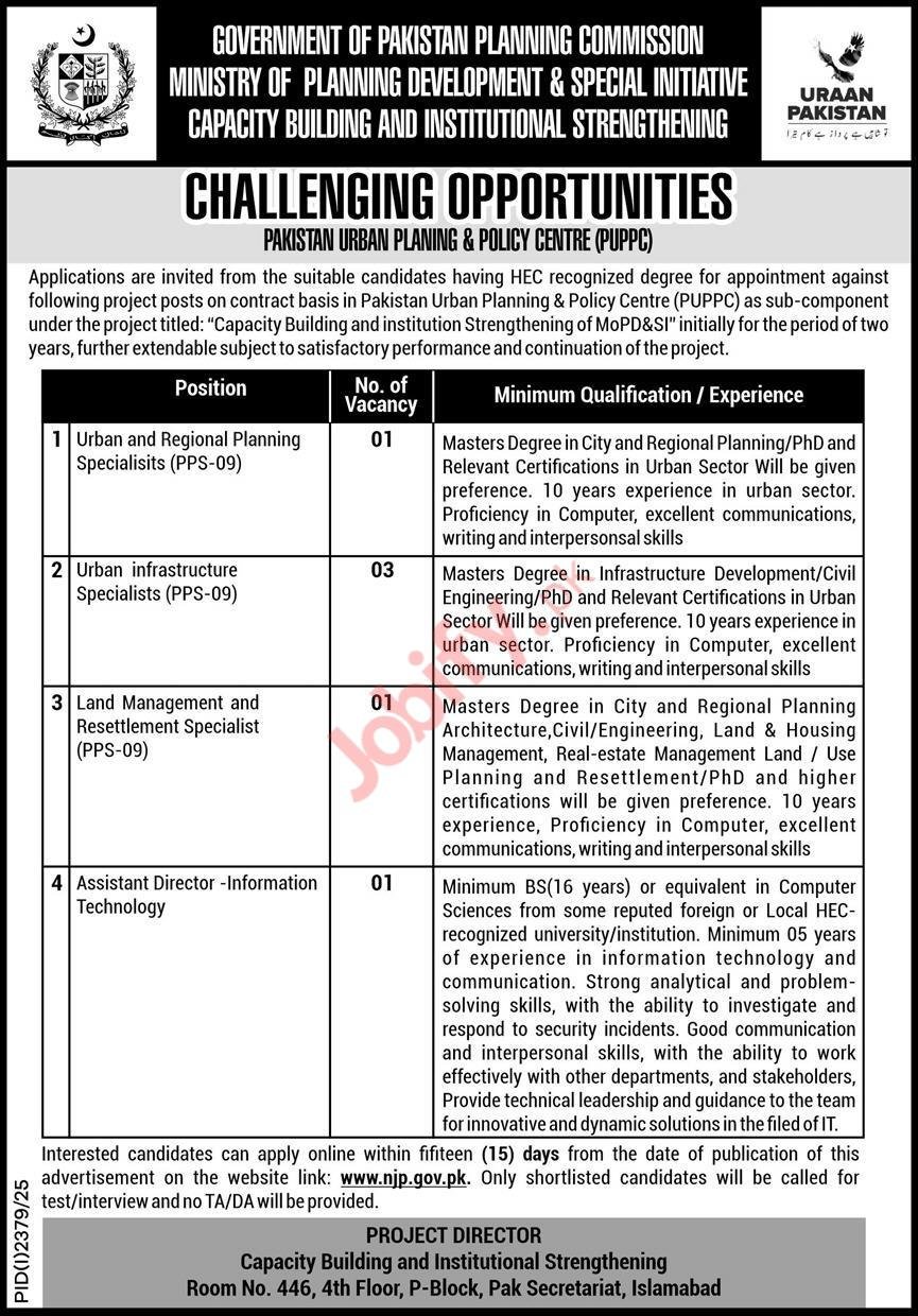 The Government of Pakistan – Planning Commission, Ministry of Planning, Development & Special Initiative (MoPD&SI) invites applications for project-based roles at the Pakistan Urban Planning & Policy Centre (PUPPC) under the PSDP project “Capacity Building and Institutional Strengthening of MoPD&SI.” Positions are based in Islamabad (Pak Secretariat) with coordination across provinces. Openings include Urban & Regional Planning Specialist (PPS-9), Urban Infrastructure Specialists (PPS-9), Land Management & Resettlement Specialist (PPS-9), and Assistant Director – Information Technology (PPS). Appointments are contractual for two years in the first instance and extendable subject to performance and continued project need.