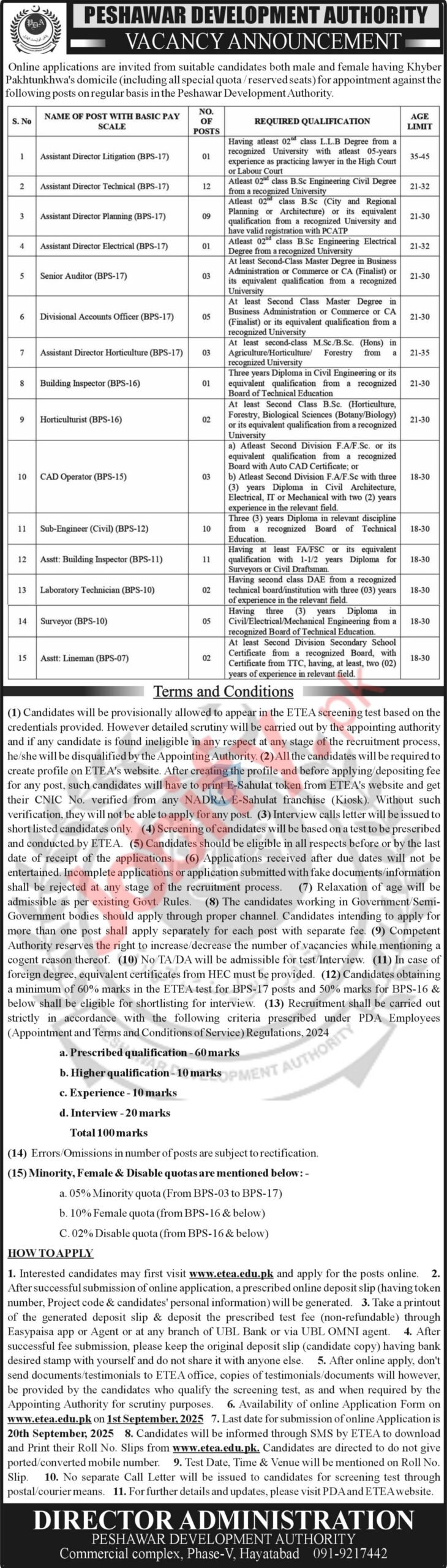 Peshawar Development Authority (PDA) is inviting online applications for regular BPS-17 to BPS-07 roles that support planning, engineering, accounts, inspection, horticulture and technical operations in Peshawar; Khyber Pakhtunkhwa domicile is required. Openings span Assistant Director tracks (Litigation, Technical, Planning, Electrical), Senior Auditor/Divisional Accounts, Horticulture, and skilled staff such as Sub-Engineer, CAD Operator, Surveyor and Laboratory.