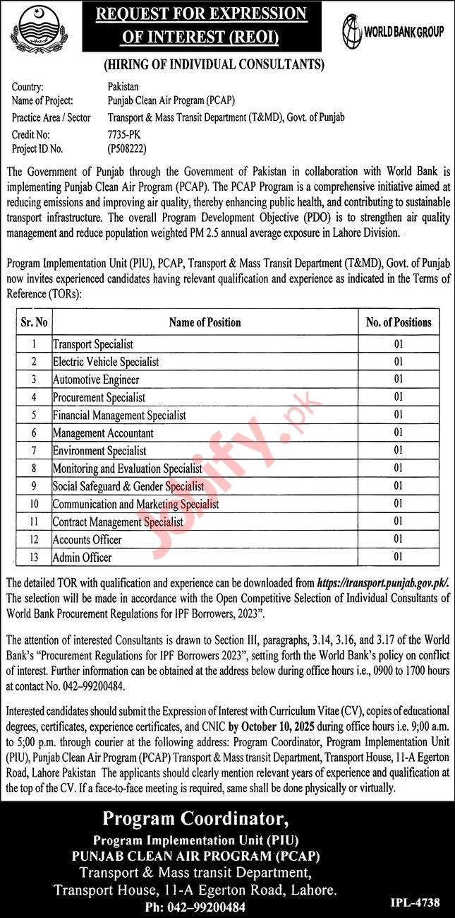 The Punjab Clean Air Program (PCAP) is scaling up delivery and now invites Expressions of Interest (EOIs) from experienced professionals to serve as individual consultants across technical, fiduciary, safeguards, and communications streams. The program—supported by the World Bank Group—is designed to reduce population-weighted PM2.5 in the Lahore Division through practical transport reforms, better monitoring, and public awareness. Assignments will be issued on a performance-based contract under the World Bank Procurement Regulations for IPF Borrowers (2023).