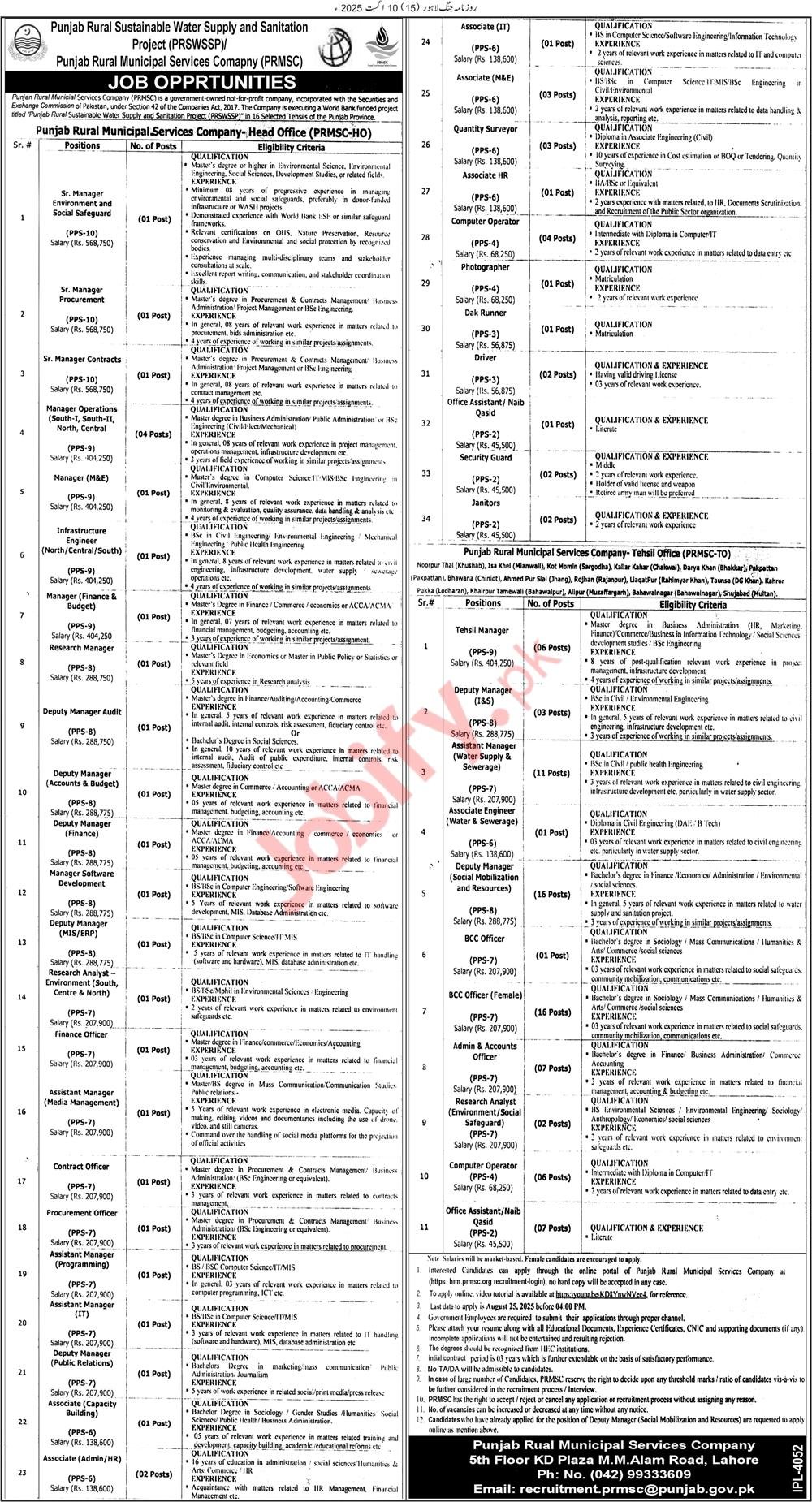 The Punjab Rural Municipal Services Company (PRMSC)—a government-owned, not-for-profit entity—is hiring on contract (extendable) for the World Bank–funded Punjab Rural Sustainable Water Supply and Sanitation Project (PRSWSSP), with roles based at the Head Office in Lahore and across multiple districts in Punjab; applications close August 25, 2025. Opportunities span senior management, technical, administrative, and support functions covering engineering, finance, procurement, IT, HR, communications, and operations, all focused on expanding safe water, sanitation, and hygiene services in rural communities. Candidates should follow the instructions in the official PRMSC/PRSWSSP notice.