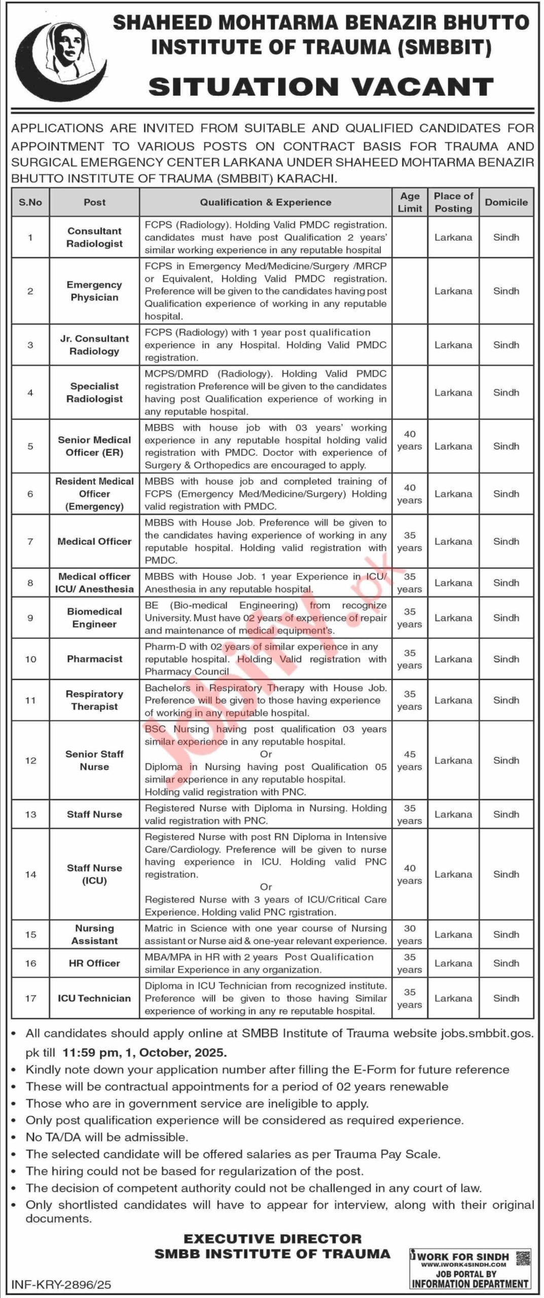 The Shaheed Mohtarma Benazir Bhutto Institute of Trauma (SMBBIT), Karachi invites applications on a contract basis for its Surgical Emergency Center, Larkana. Multiple clinical, nursing, and support positions are open to qualified, compassionate professionals who want to work in a high-acuity, patient-first environment. Roles include Consultant Radiologist, Emergency Physician, Junior Consultant Radiology, Specialist Radiologist (MCPS/DMRD), Senior Medical Officer (ER), Resident Medical Officer (Emergency), Medical Officer, Medical Officer (ICU/Anesthesia), Biomedical Engineer, Pharmacist, Respiratory Therapist, Senior Staff Nurse, Staff Nurse, Staff Nurse (ICU), Nursing Assistant, HR Officer, and ICU Technician. Duty station is Larkana, Sindh; domicile: Sindh.
