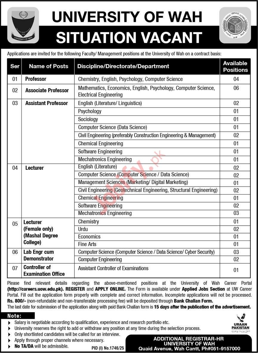 University of Wah (Wah Cantt) is inviting applications for contract faculty and staff rolesโProfessor, Associate Professor, Assistant Professor, Lecturer (including female-only posts at Mashal Degree College), Lab Engineer cum Demonstrator, and Assistant Controller of Examinationsโacross disciplines spanning Chemistry, English, Psychology, Computer Science/Data Science, Mathematics, Economics, and Engineering fields. Apply online via the UW Career Portal.ย Based in Wah Cantt, these roles offer classroom, lab, and examination administration experience in departments including Electrical, Civil, Chemical, Software, Mechatronics, Management Sciences, Urdu, and Fine Arts. Fresh graduates may apply for Lecturer and Lab Engineer cum Demonstrator, and female candidates are strongly encouraged; ensure complete documents (degrees/transcripts, CNIC, photo, experience/publications) to avoid screening delays.